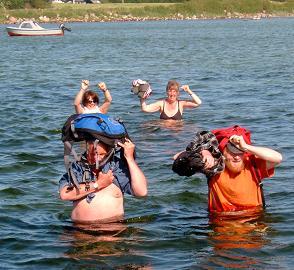 Vi seglade också över till en vik på Lolland, där vi lämnade båtarna på redden och vadade in i knähögt vatten för en naturskön promenad och bad på andra sidan ön. Men när vi kom tillbaka till båtarna hade vattnet stigit högst betydligt, som synes av bilden till höger. Arrangörerna hade också specialprogram för barn och ungdomar, bl a försvann de äldre ungdomarna för en övernattningstur en av de första dagarna, och även de yngre barnen fick göra egna utflykter.
